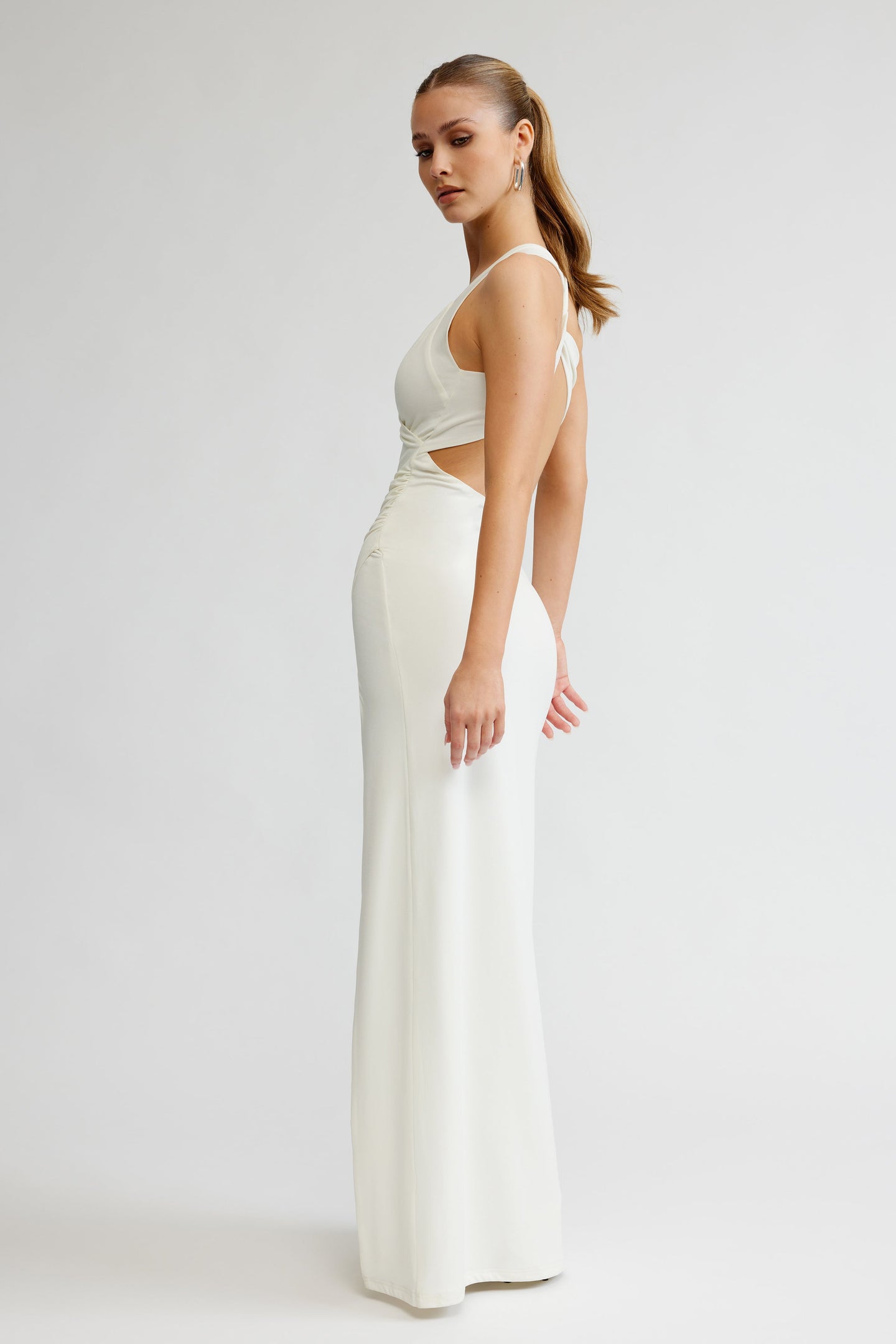 The Iva Dress is cut from our stretchy jersey and features a v-neckline and cross over wrap design that gathers in at the waist and eventuates into a thigh high split. It is full in length and has an exposed back with a twist design detail.