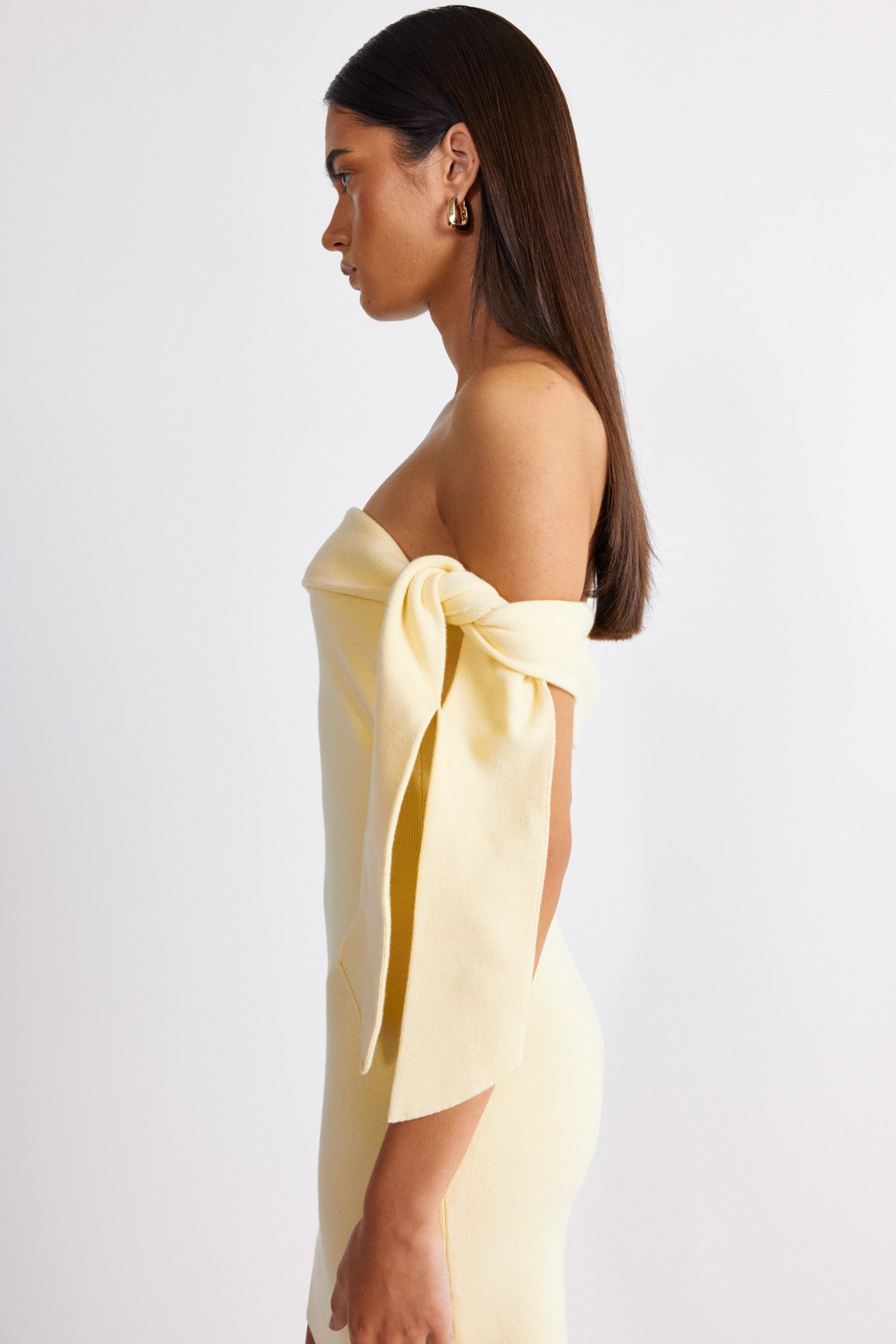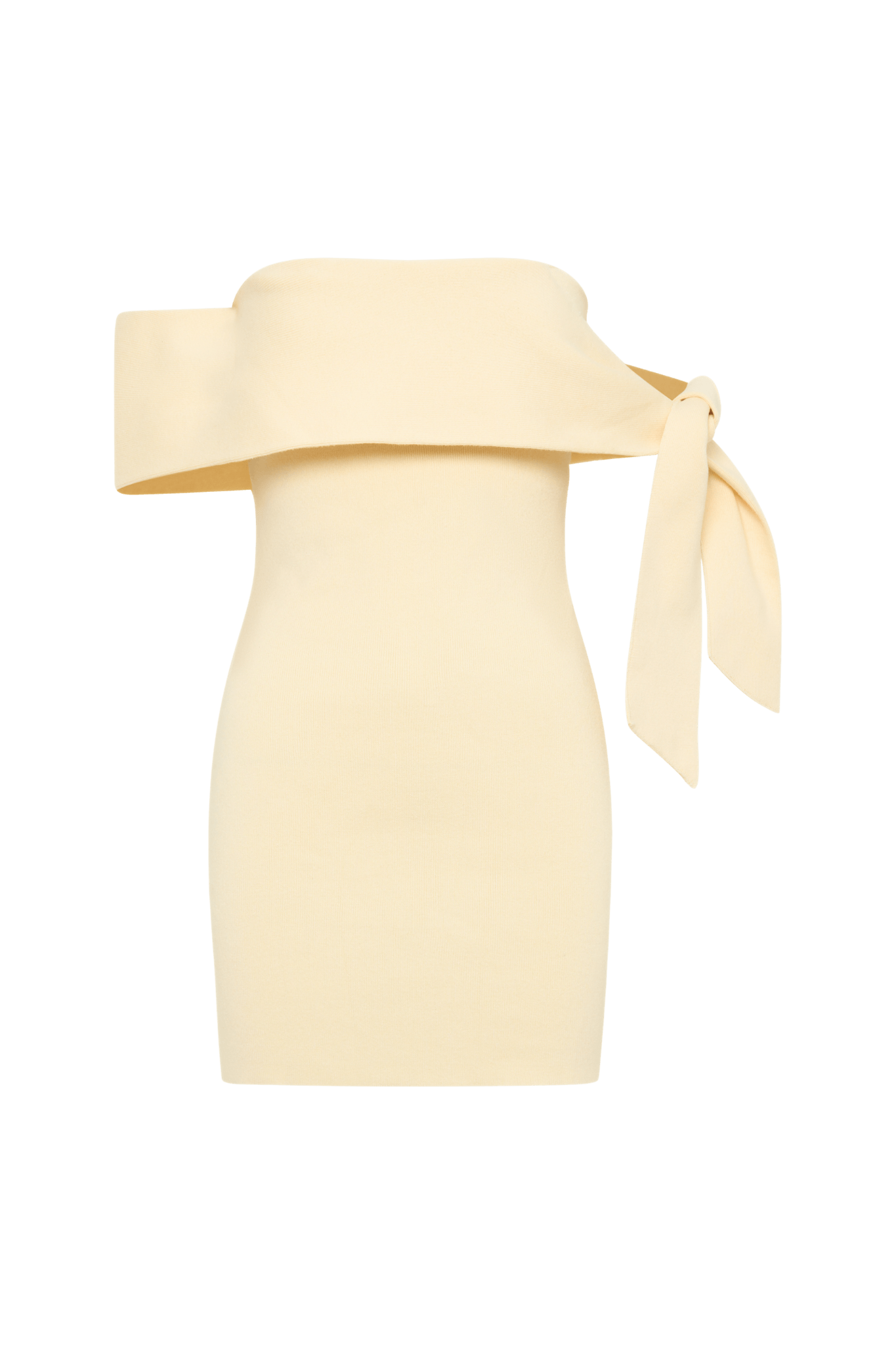 The Jaymes Mini Dress is a mini length dress with folded off the shoulder feature and soft tie at the arm. It is made of a soft stretch knit fabrication.
