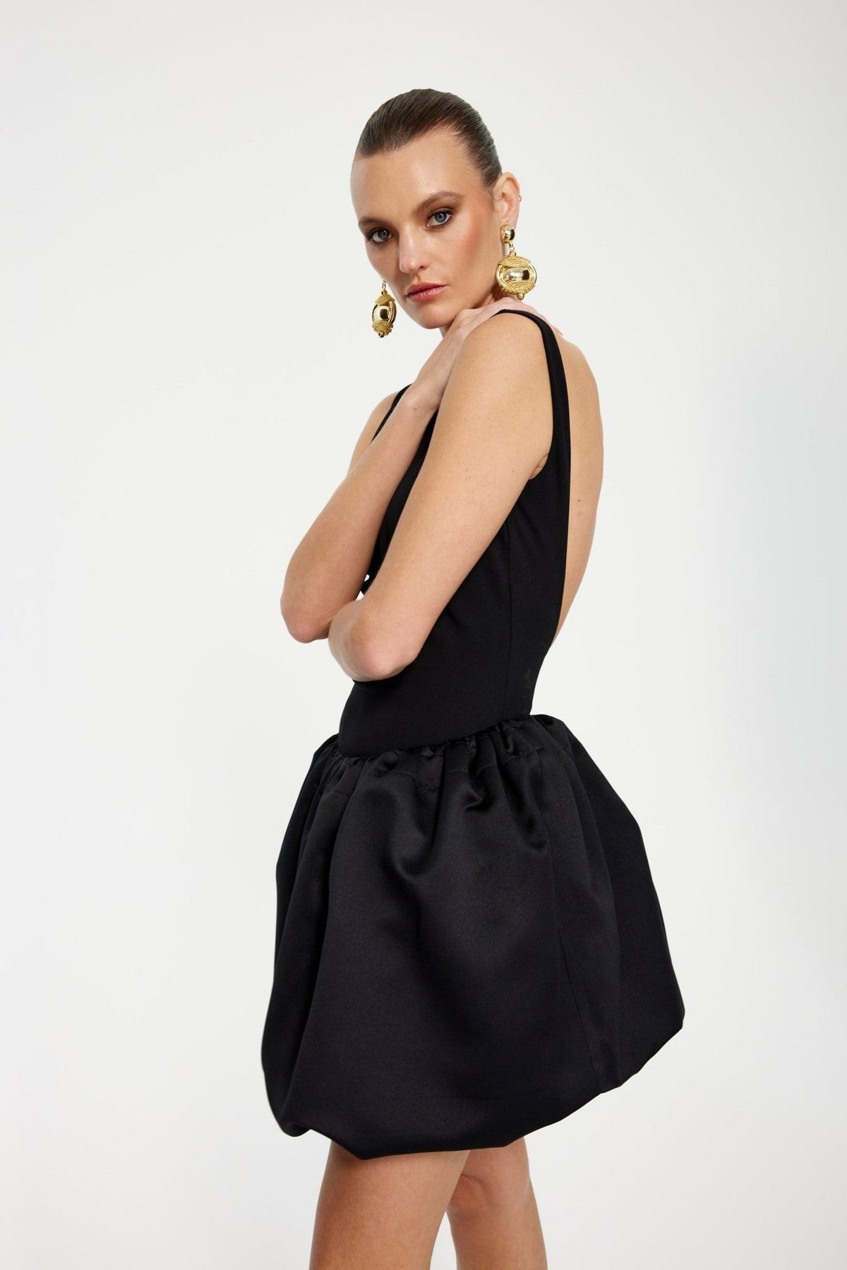 Our Keke Mini features a straight neckline and a deep back, with an asymmetrical hem featuring detailed pleats and a luxurious bubble skirt.