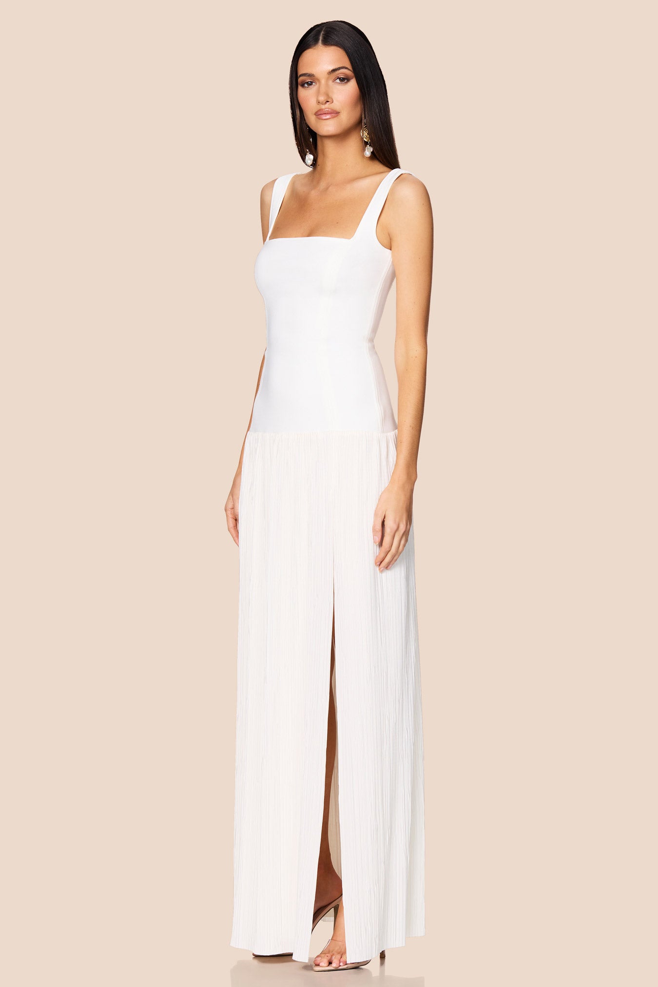 The Nookie Desiree Square Neck Maxi is a statement staple maxi dress with classic Nookie square neckline. Bodice is crafted in a stretch bonded crepe, the skirt is a soft pleated jersey. Invisible zip at back. Bodice is lined.