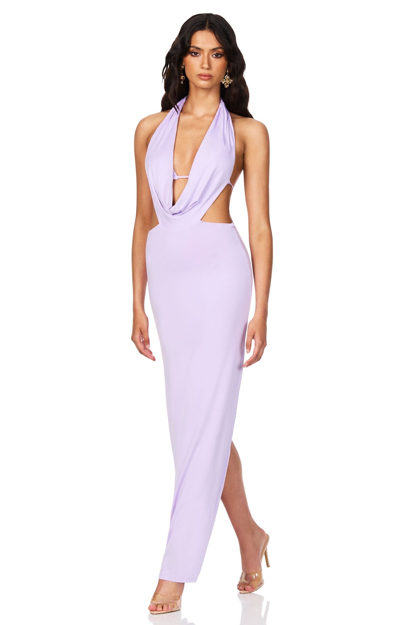 The Nookie Olivia Drape Dress is a glamorous cut out gown, crafted in our slinky jersey with a plunging draped neckline. Featuring a cut out detail at front waist, sexy low back, halter ties at neck, adjustable strap at back and invisible zip at back waist.
