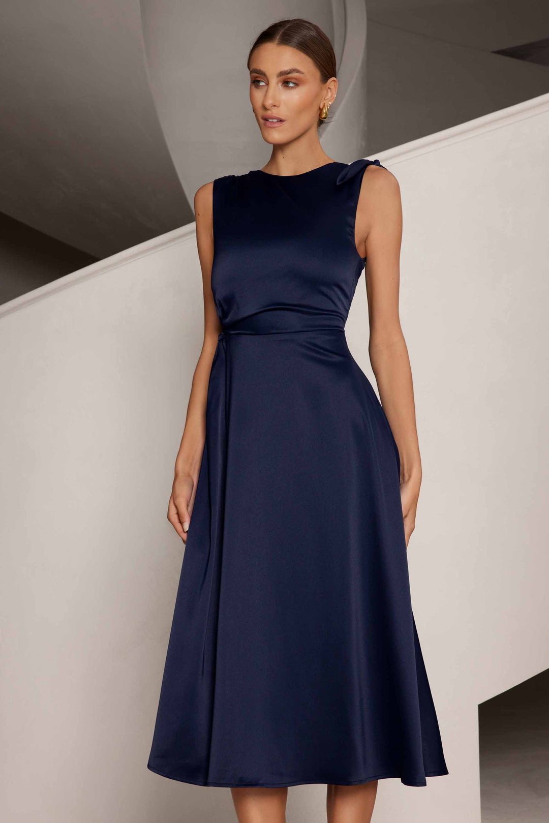 The elegant and timeless Lisa midi features a high neck design which is complimented by the ever-so elegant subtle side waist cinch and knot. This stunning piece also features a one shoulder bow design a & sophisticated A-line skirt.