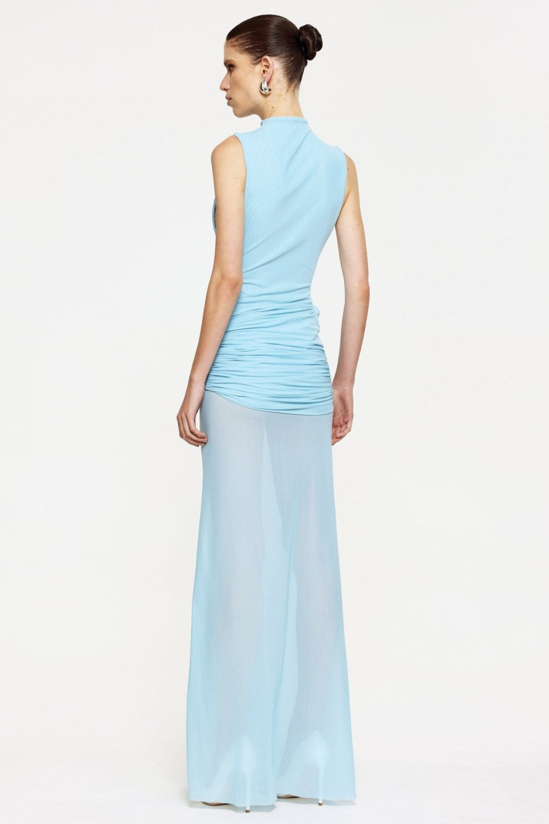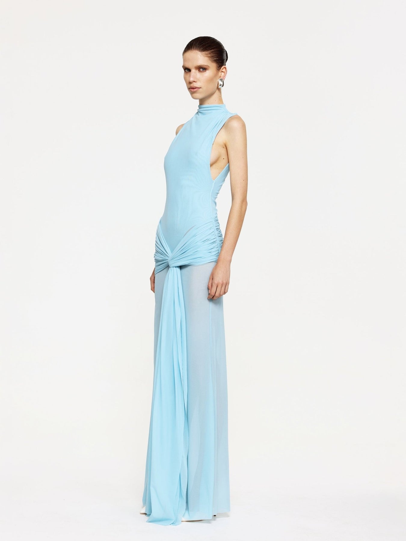 Our favourite mesh maxi in a new colour for the summer season ahead. High neckline design with a fitted silhouette, featuring a twisted drape gathering down the body. Bodysuit lined under dress for added coverage.