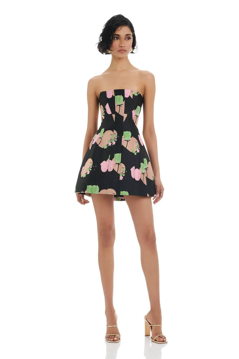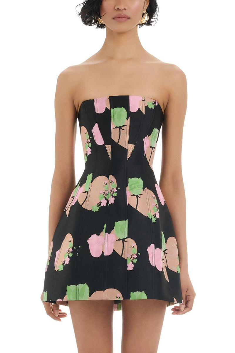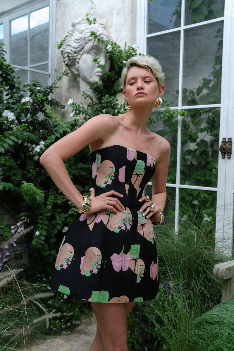 With its elegant straight neckline and strapless design, the Sidney Dress is a standout mini dress that is crafted from our floral jacquard fabric. It features boning in the bodice and detailed top stitching throughout, enhancing its structured silhouette and adding a refined touch before cascading into a full mini skirt. Completed with an invisible zipper, the Sidney Dress offers a blend of timeless sophistication and contemporary style.