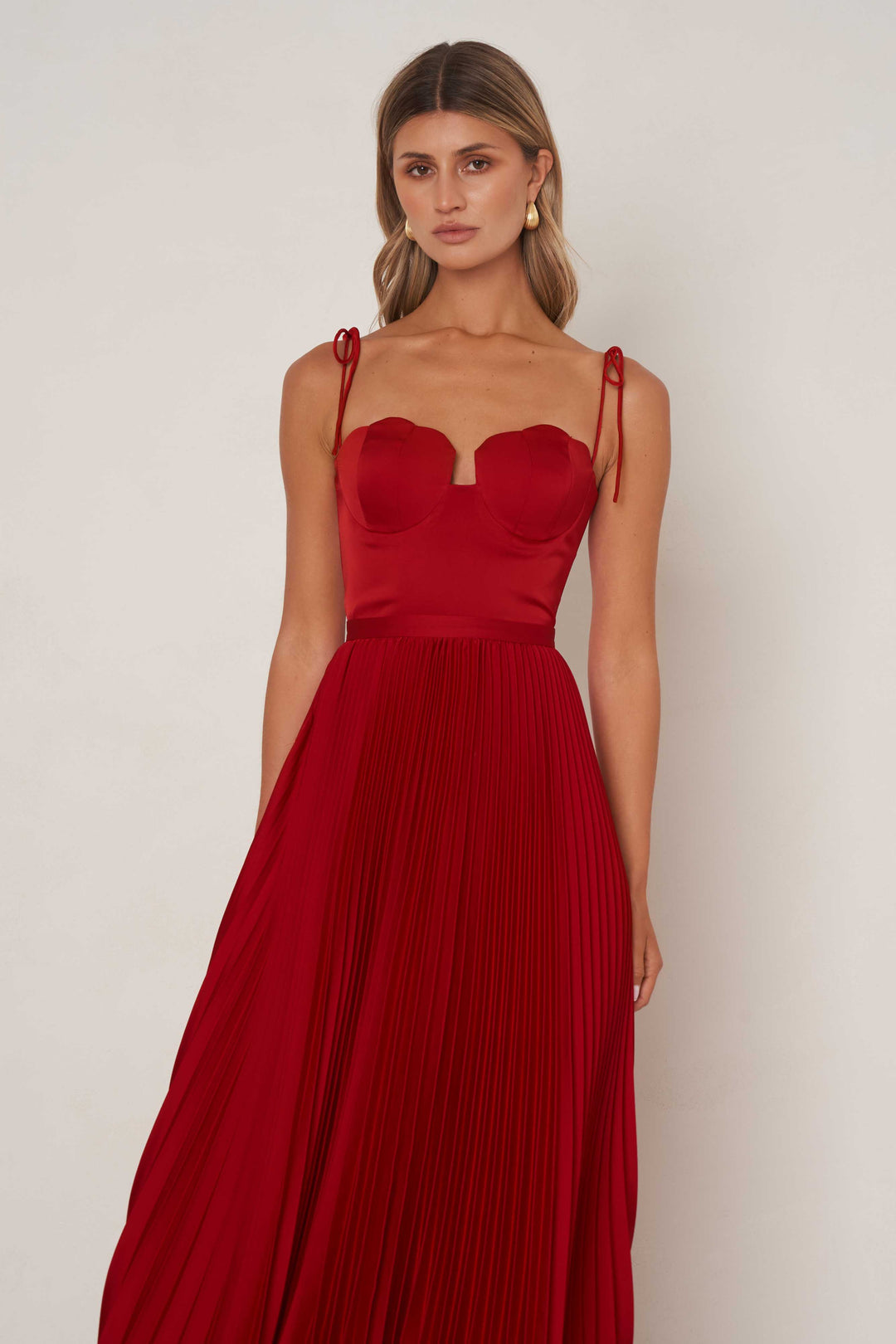 The Whitney dress is a gorgeous floaty midi, featuring a scalloped bustier detail and tie up straps. The Aline pleated skirt full and floaty creating an elegant and fun silhouette. also available in Sand and Tangerine.