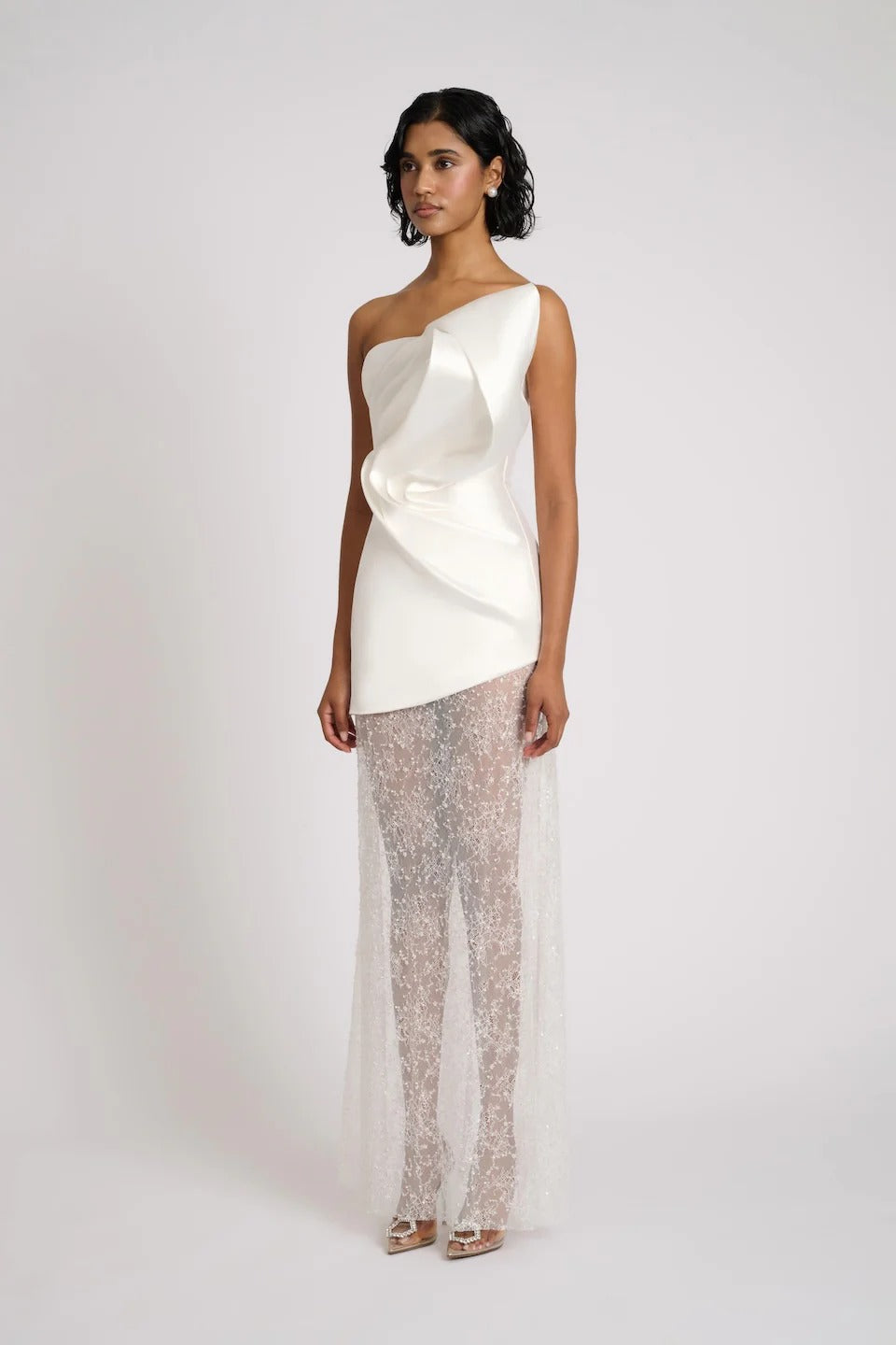 Flowing from the cinched waist, the dress transitions into an asymmetric hemline, creating a striking silhouette that is both contemporary and timeless. Beneath the sculptural layers lies a sheer embellished lace underlay, offering a subtle hint of sparkle and allure with every step.
