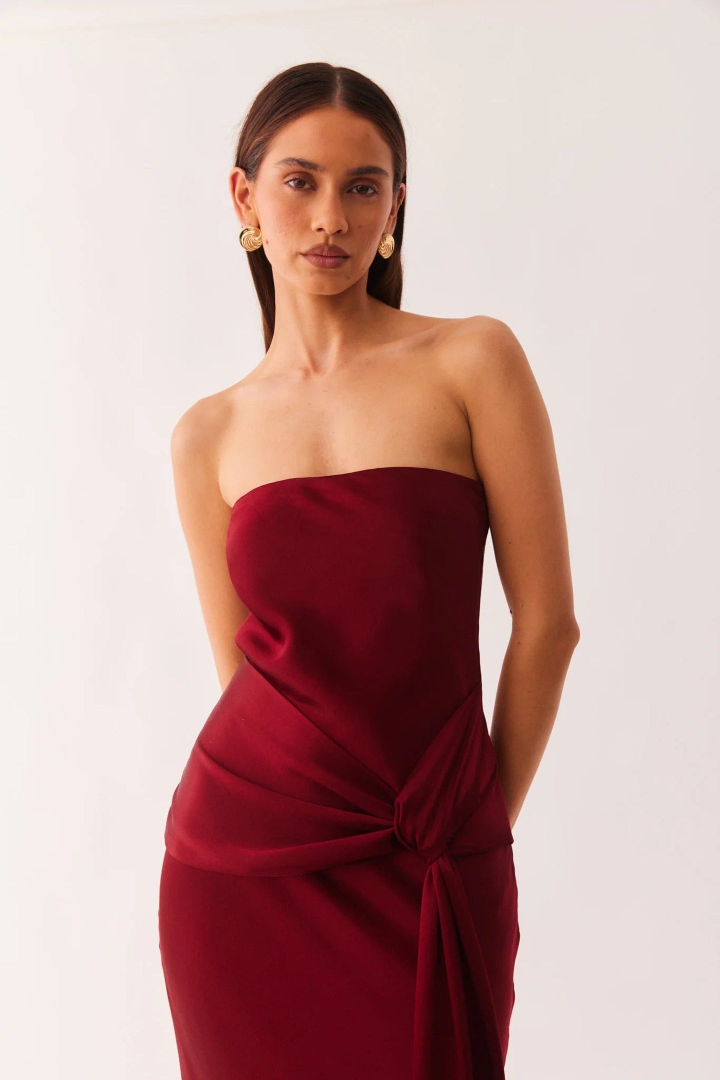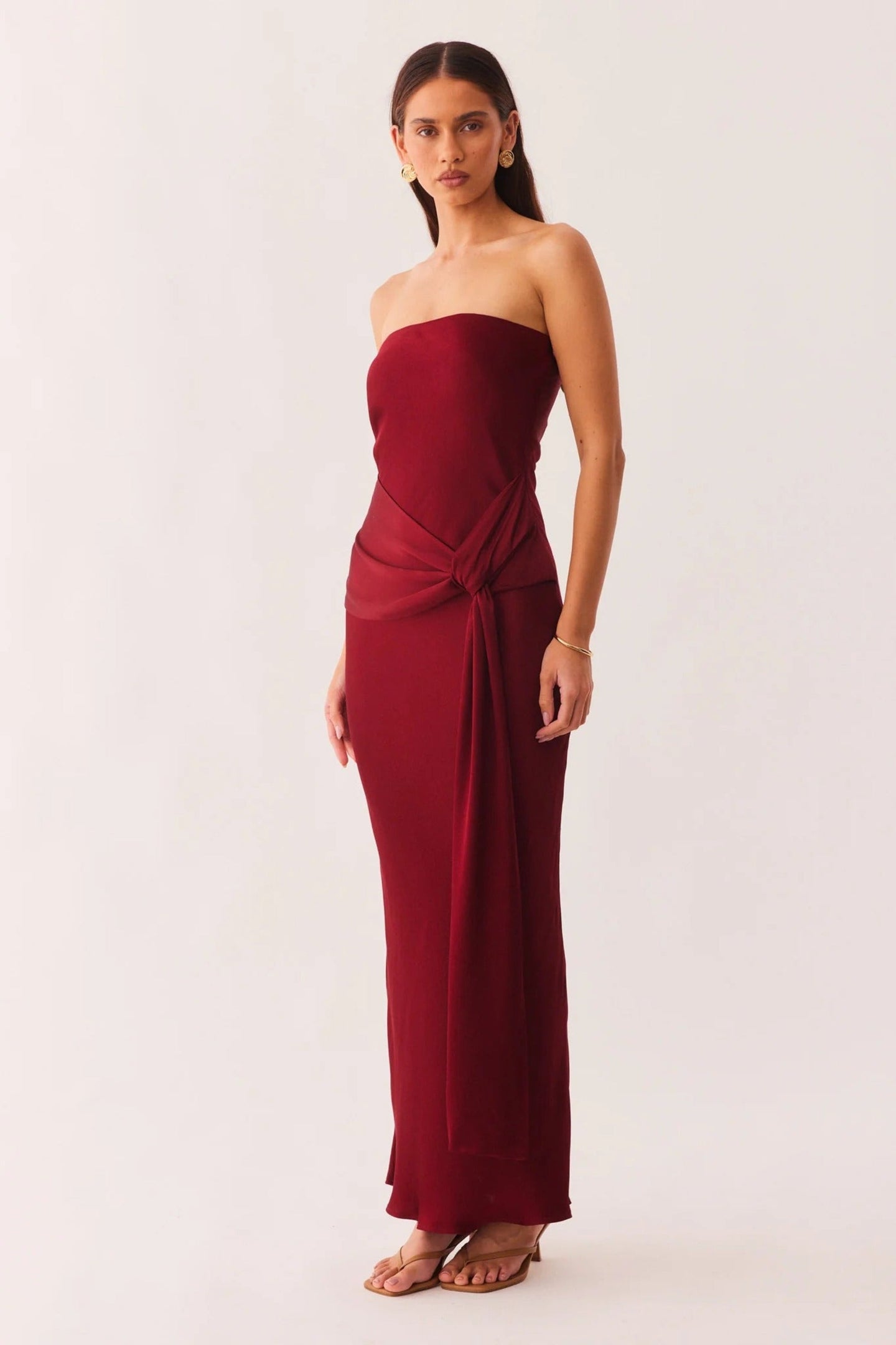 Turn heads in the effortlessly chic Angie Front Tie Maxi Dress, crafted from delicate, silky satin that drapes beautifully on the body. Featuring a flattering strapless neckline with gel grip tape for a secure fit, this dress includes a ruched front tie detail that adds subtle texture and shape. The invisible side zipper ensures a seamless silhouette, while the lined interior provides added comfort. Fabric is extremely delicate and should be treated with care.