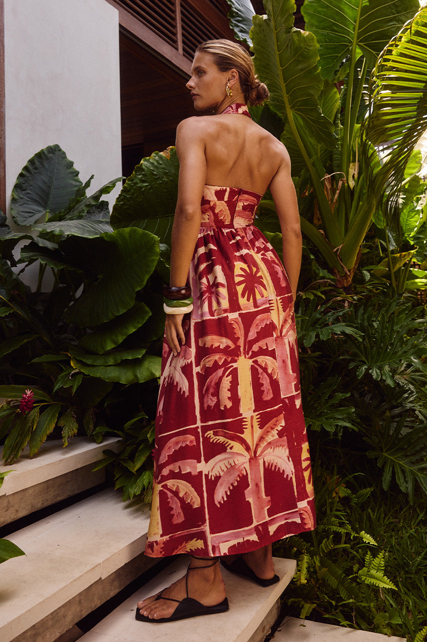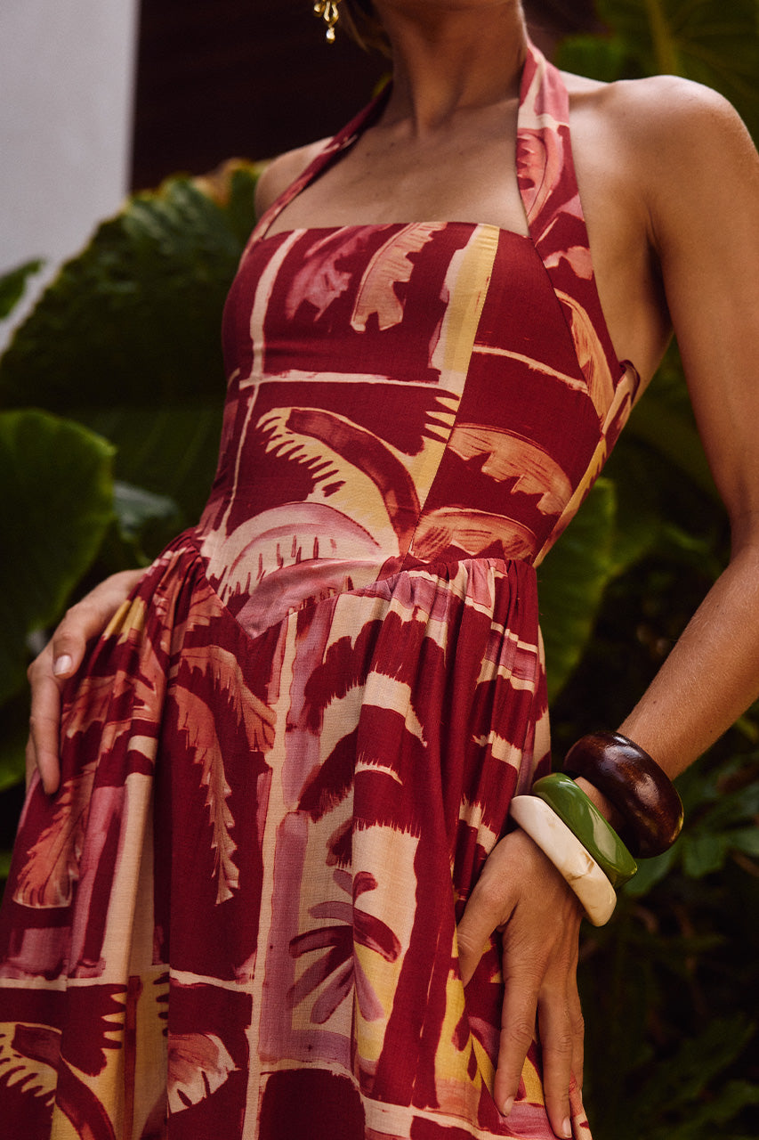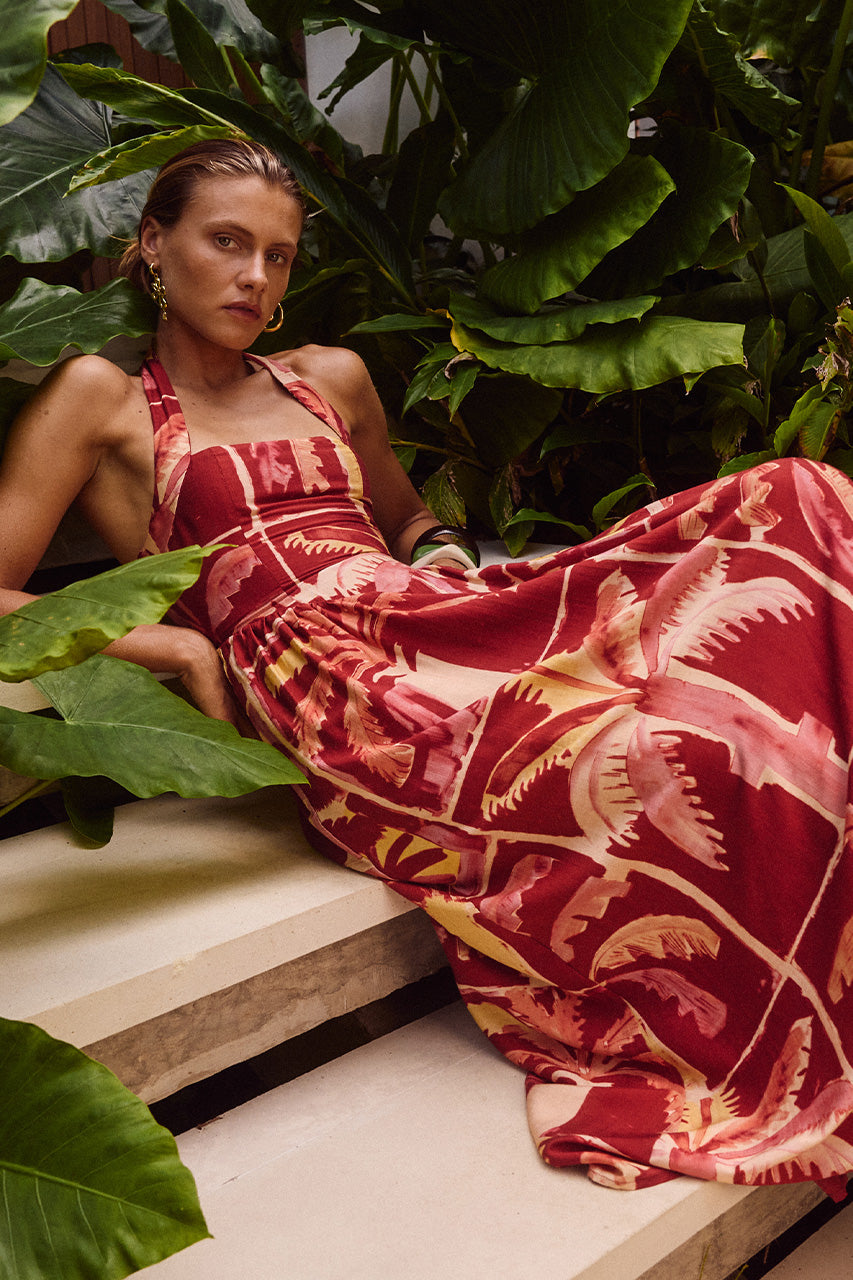 With a fitted bodice and halter neck in a tropical, earthy toned print, our Arlo Midi Dress is your perfect summer dress.