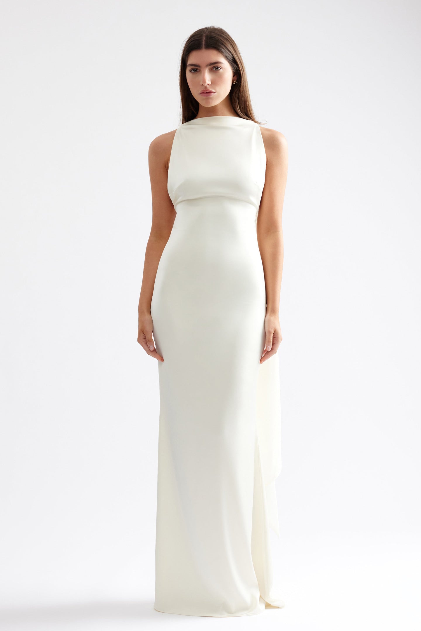 The Audrey Dress is a timeless and elegant choice. It features a demure high neckline at the front and a dramatic low back with draped sashes in a contrast georgette from the shoulders. The open back is secured with tie-up straps for a chic finish.