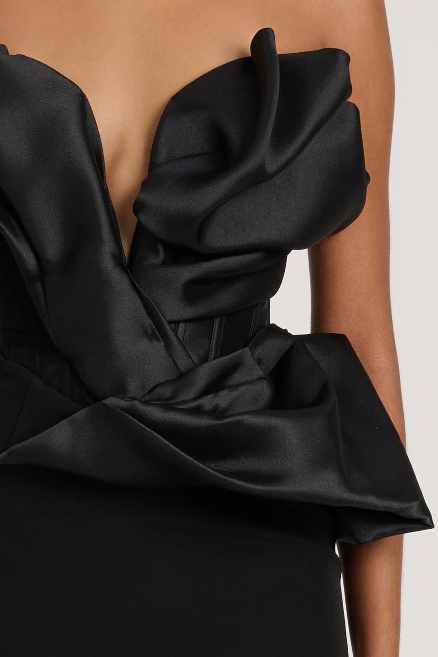 What truly sets the Auri Gown apart is its unique bodice draping detailing, meticulously crafted in mikado, to create an elegant flow that defines the gown's silhouette. The floor-length crepe skirt features a subtle centre back split, adding an element of contemporary allure and movement to the otherwise elegant piece.
