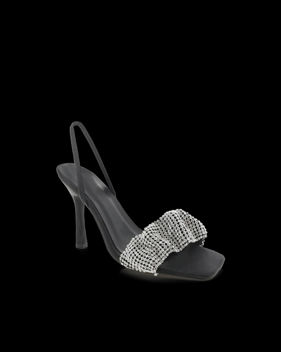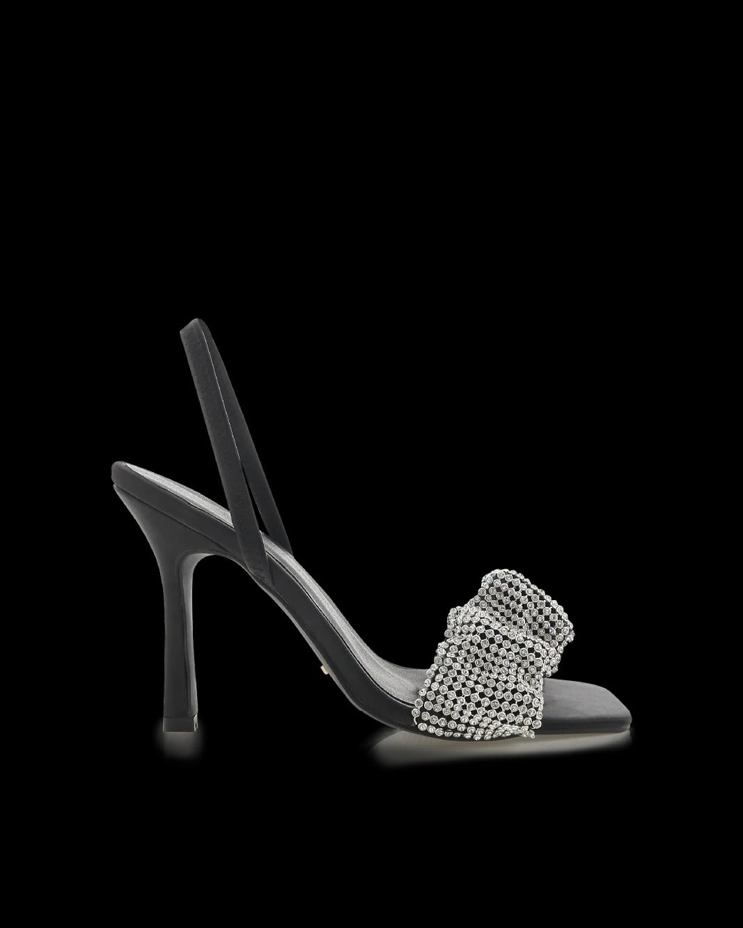 Brandi Heels are a glam sling back stiletto. Take flirty and feminine to the next level with this diamante encrusted scrunchie strap heel.