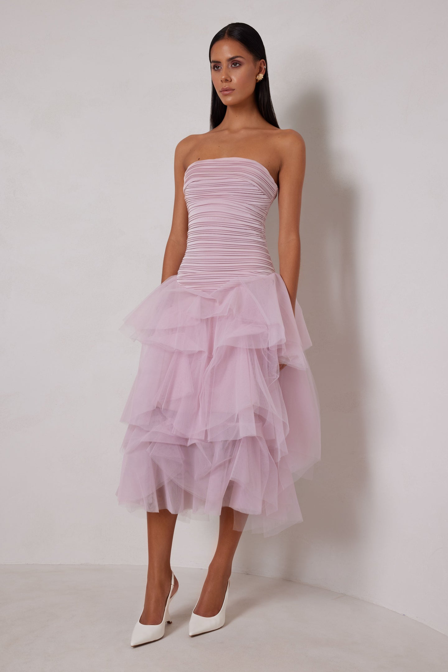 Designed with a beautifully ruched bodice, the Celine Dress accentuates the figure while providing a flattering, form-fitting silhouette. The playful tiered tulle skirt adds volume and movement, creating a romantic and whimsical look. Falling gracefully below the knees. Also available in Black & Ivory.