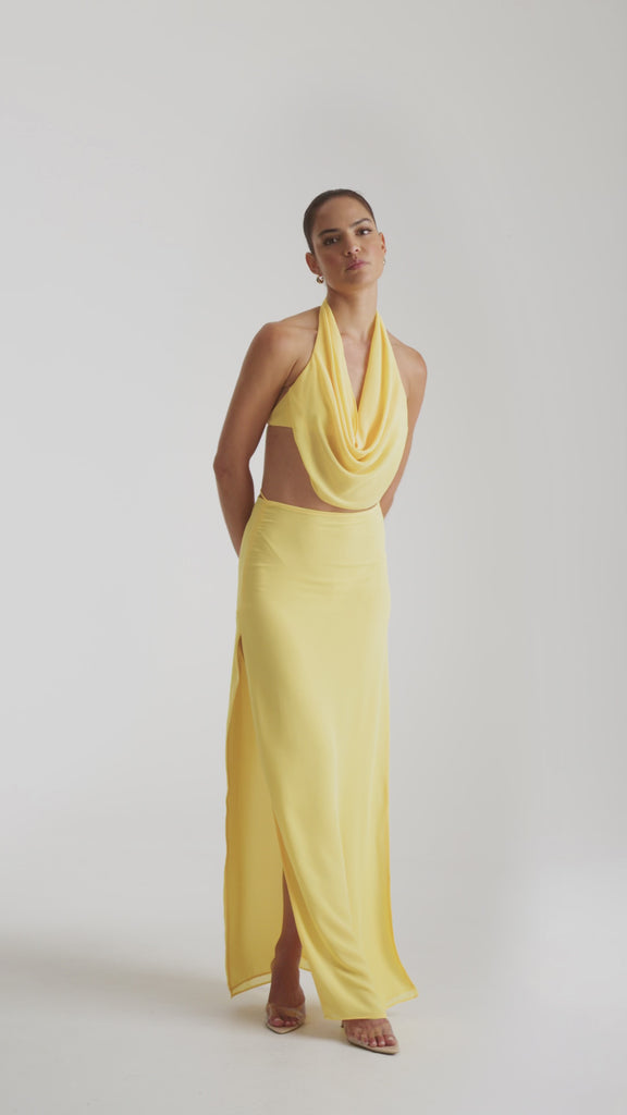 The Clio Set showcases an extravagant, beautifully draped deep cowl neckline, crafted from our lightweight georgette. The sexy exposed back features tie up horizontal straps finished with a resin bead. The skirt is designed with a sleek straight fit, back cowl, and side splits.