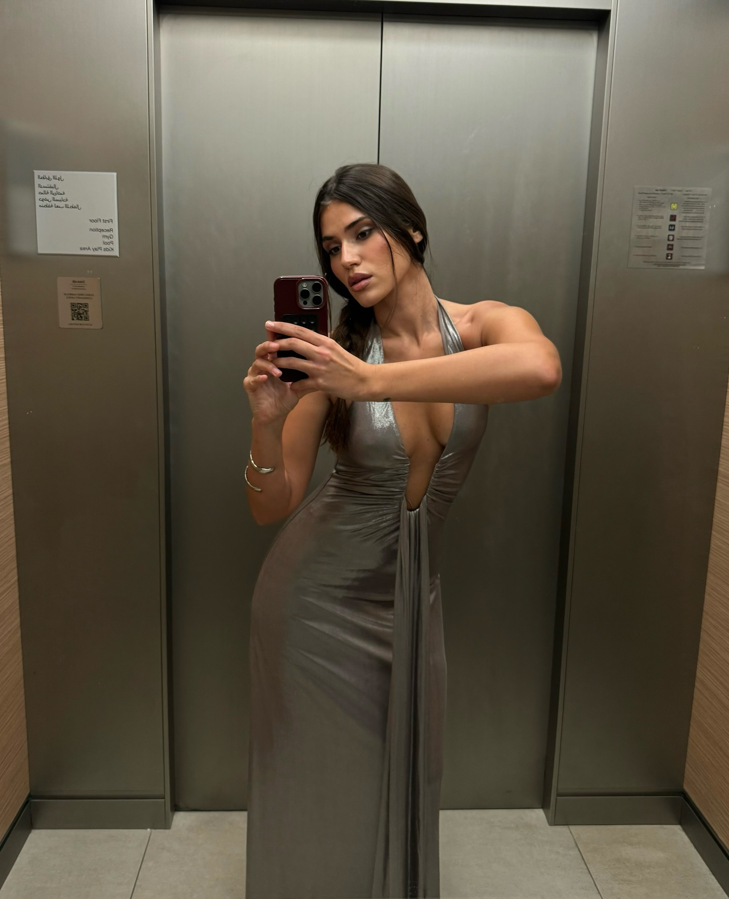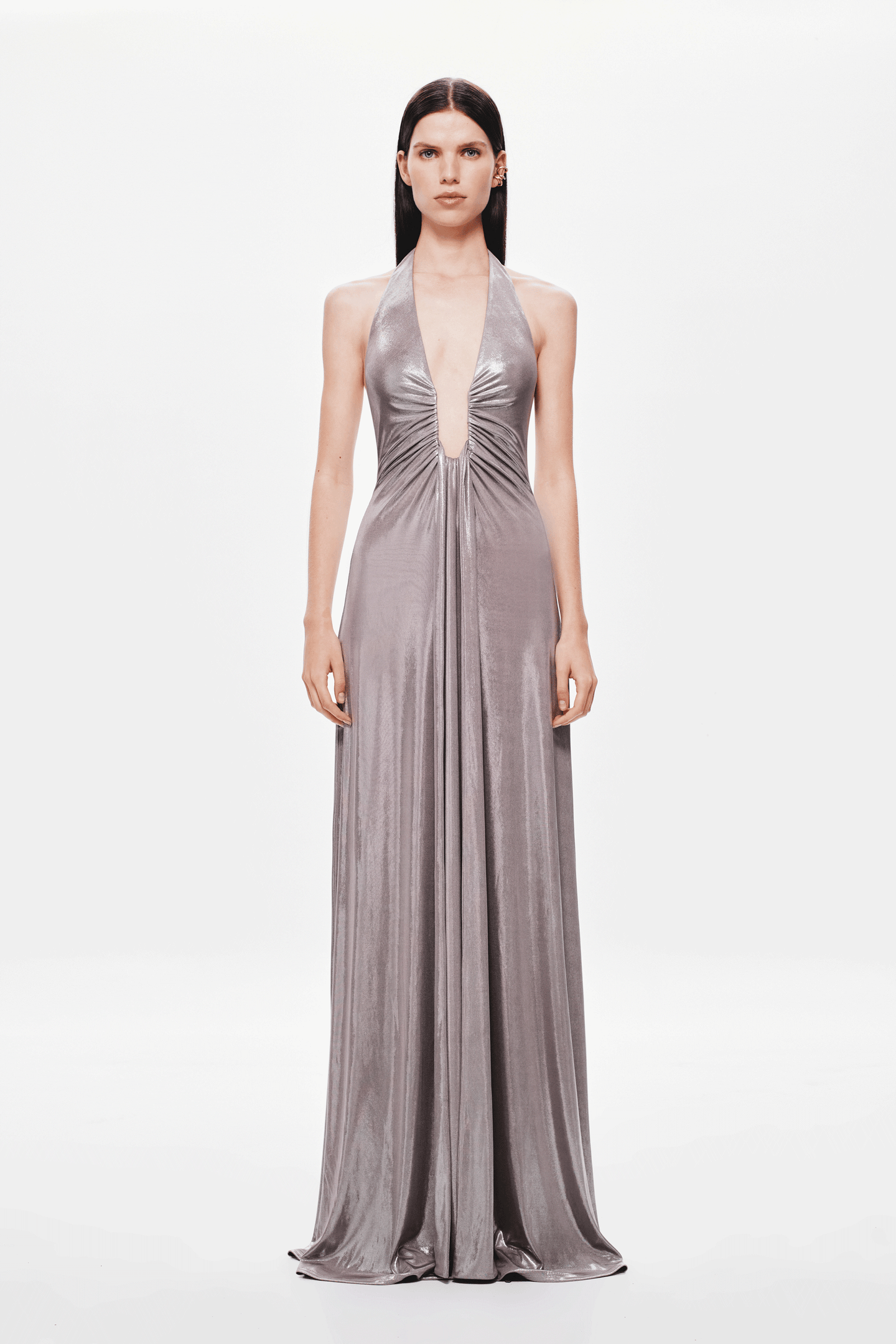 The Misha 'Jennifer' Foil Jersey Maxi Dress in Metallic Cinder, a captivating and sexy silhouette that is a true reflection of MISHA's brand DNA. The plunging halter neckline that is finished with an adjustable wire and waterfall sash detailing. Jennifer pushes the boundaries with her long clean lines that expose the wearers cleavage ever so subtly.