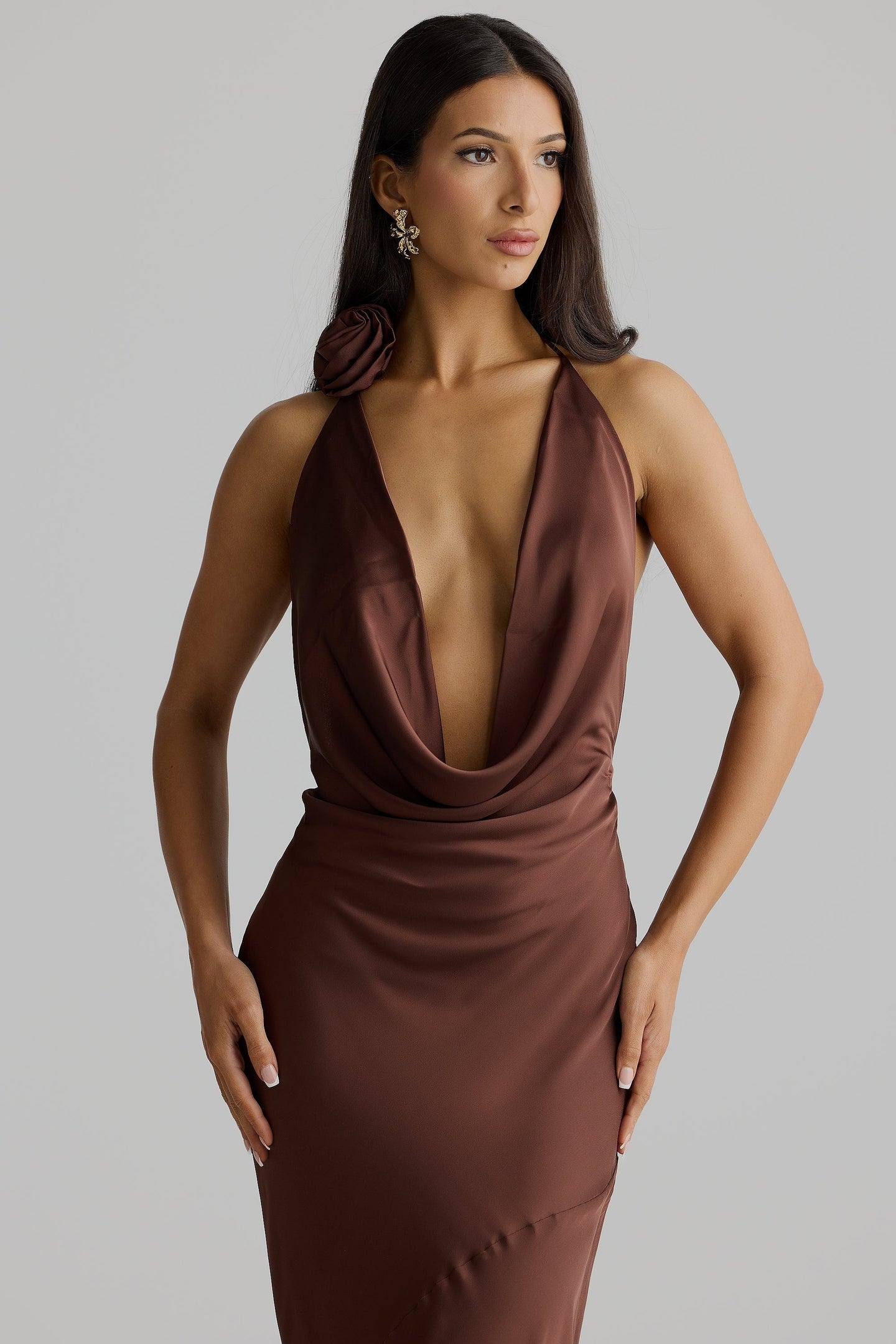 Introducing the Josefina dress, crafted from a lightweight silky satin. Josefina is a timeless staple. She features a timeless cowl neckline, soft drape back detailing, and a detachable flower. She makes the perfect silhouette for your next special event.