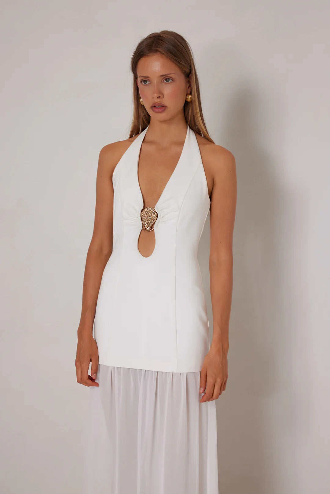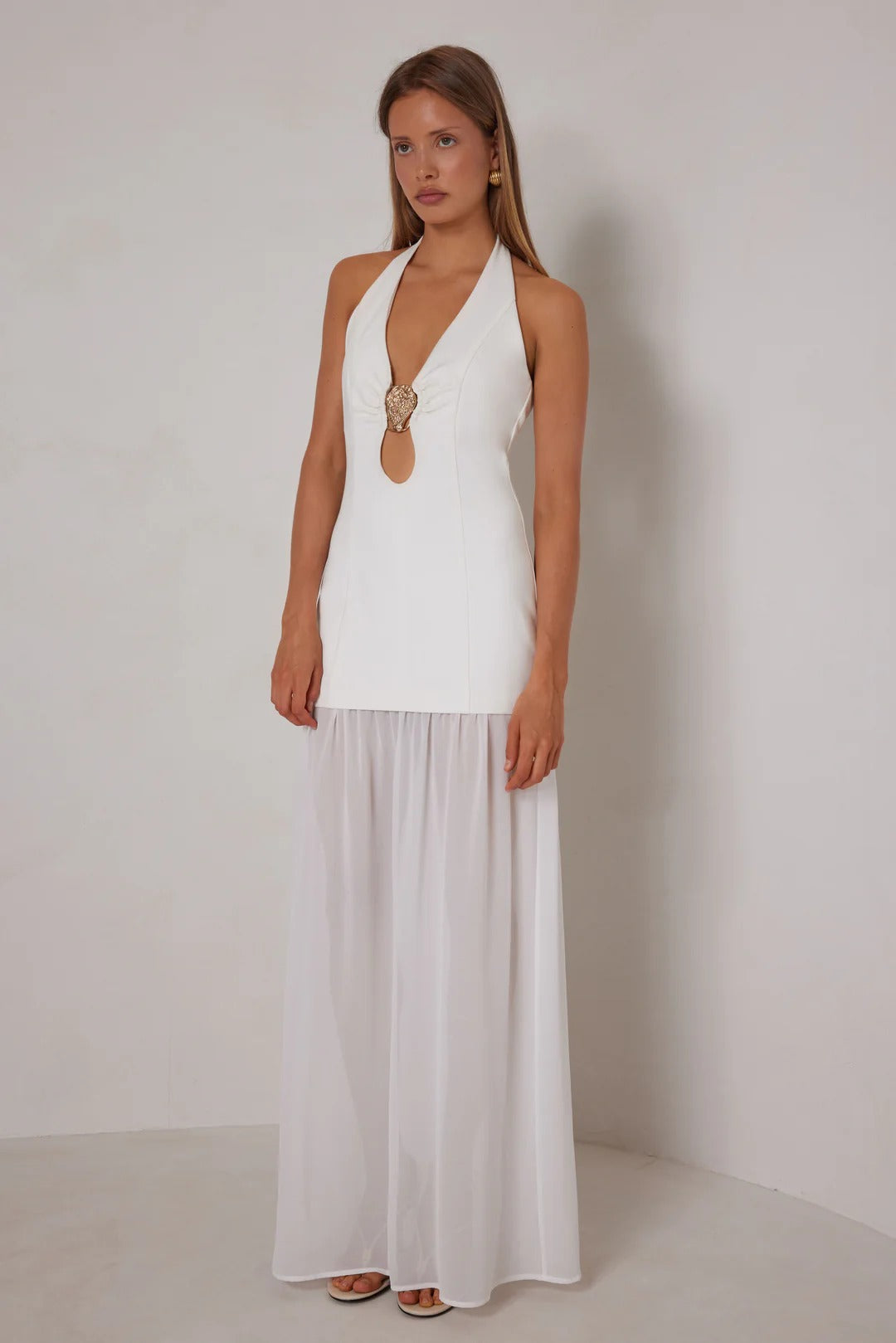 The Madeleine dress features a halter neckline that elegantly frames the shoulders, leading to a daring plunge at the front, highlighted by a striking gold embellishment at the centre. The fitted bodice transitions seamlessly into a flowing maxi skirt made from lightweight, sheer fabric.
