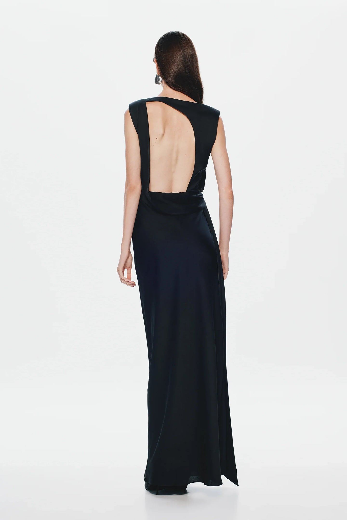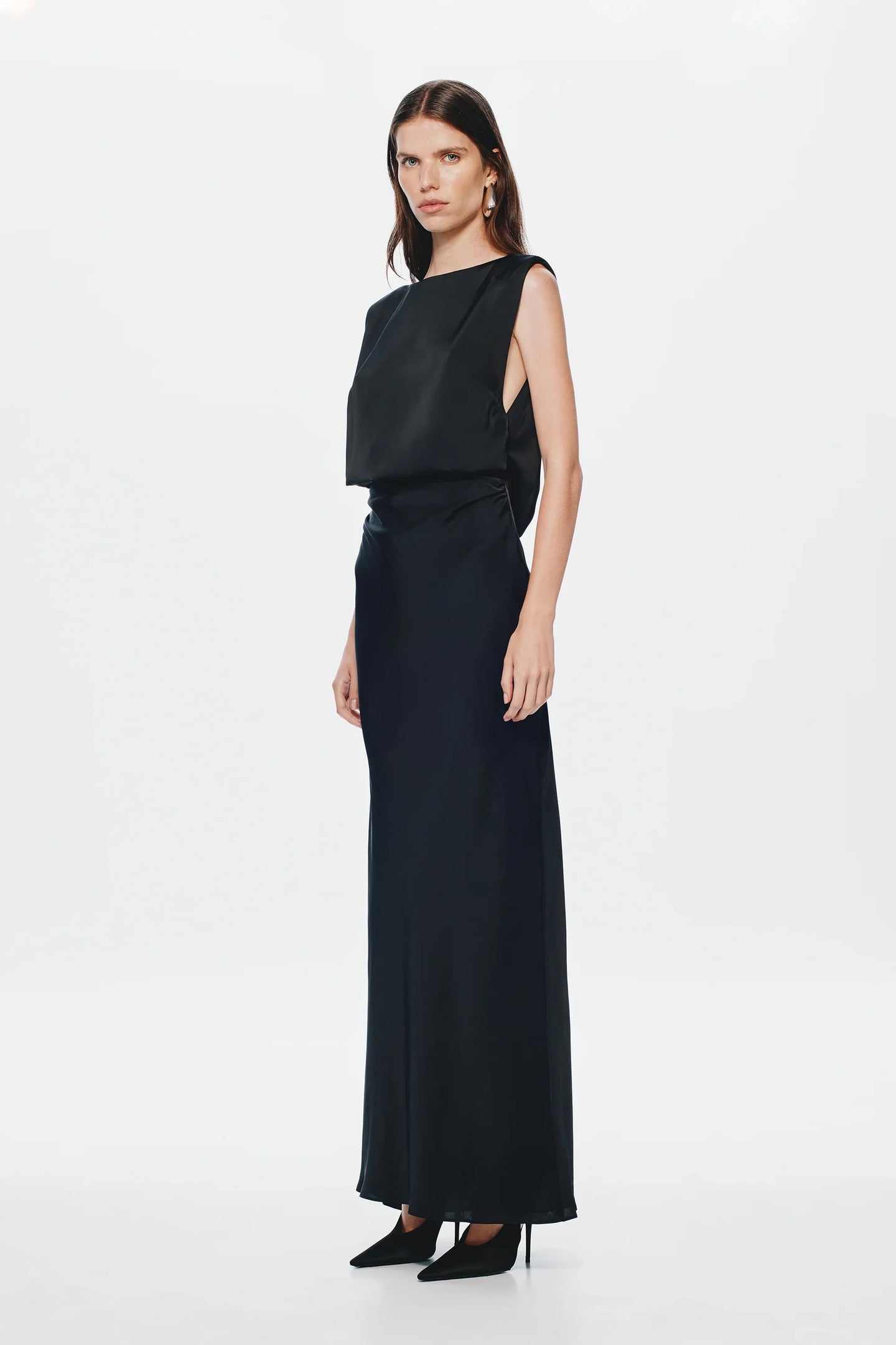 The Misha Rocky Satin Dress - Black is a structured silhouette that shares a high neckline and exposed back. Blouson in style, the dress accentuates the waistline creating a refined look.