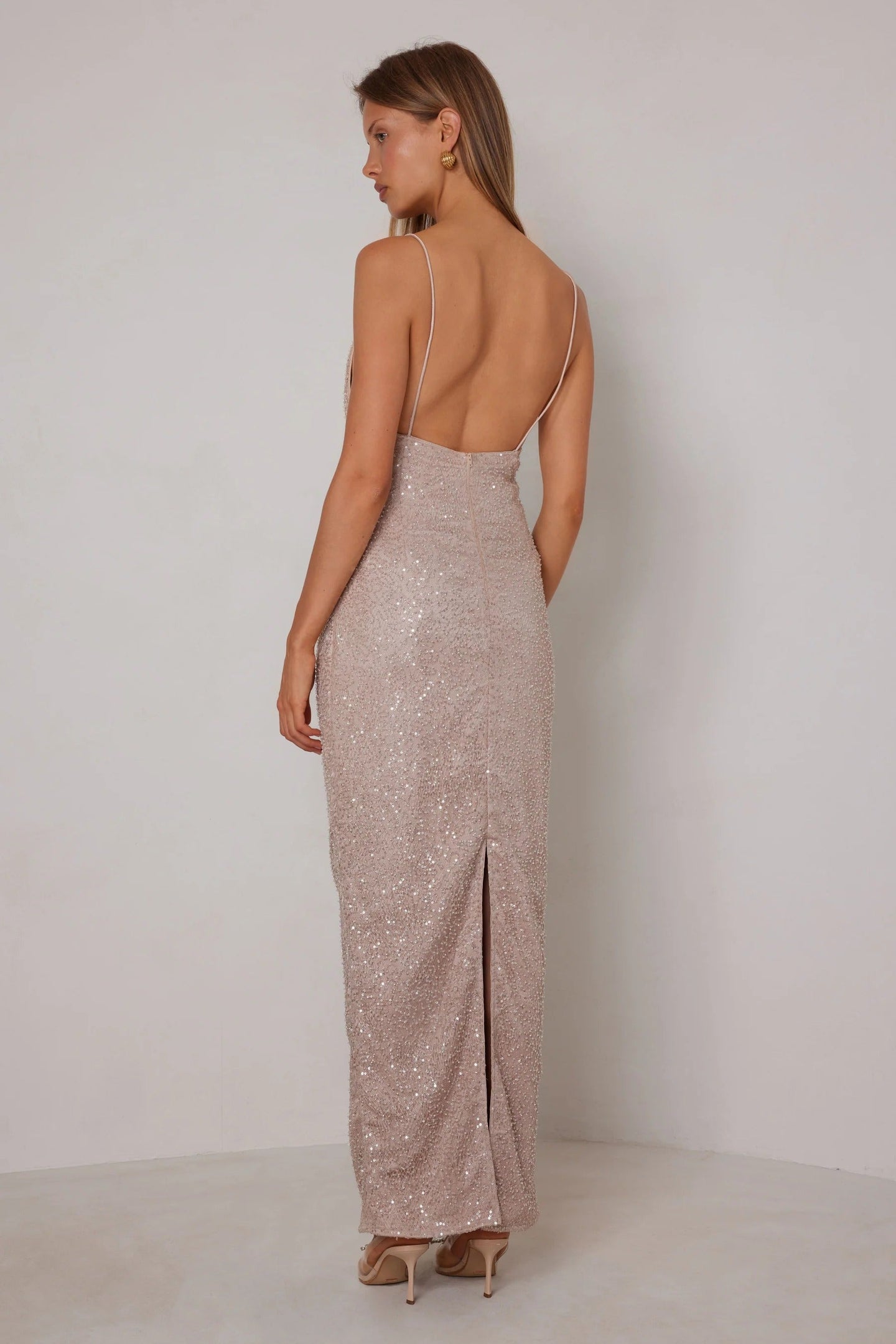 This stunning dress is a perfect blend of elegance and style featuring a delicate beaded design that catches the light beautifully. With its low back and spaghetti straps, the dress exudes a sexy sophistication. This piece promises to make a memorable statement.